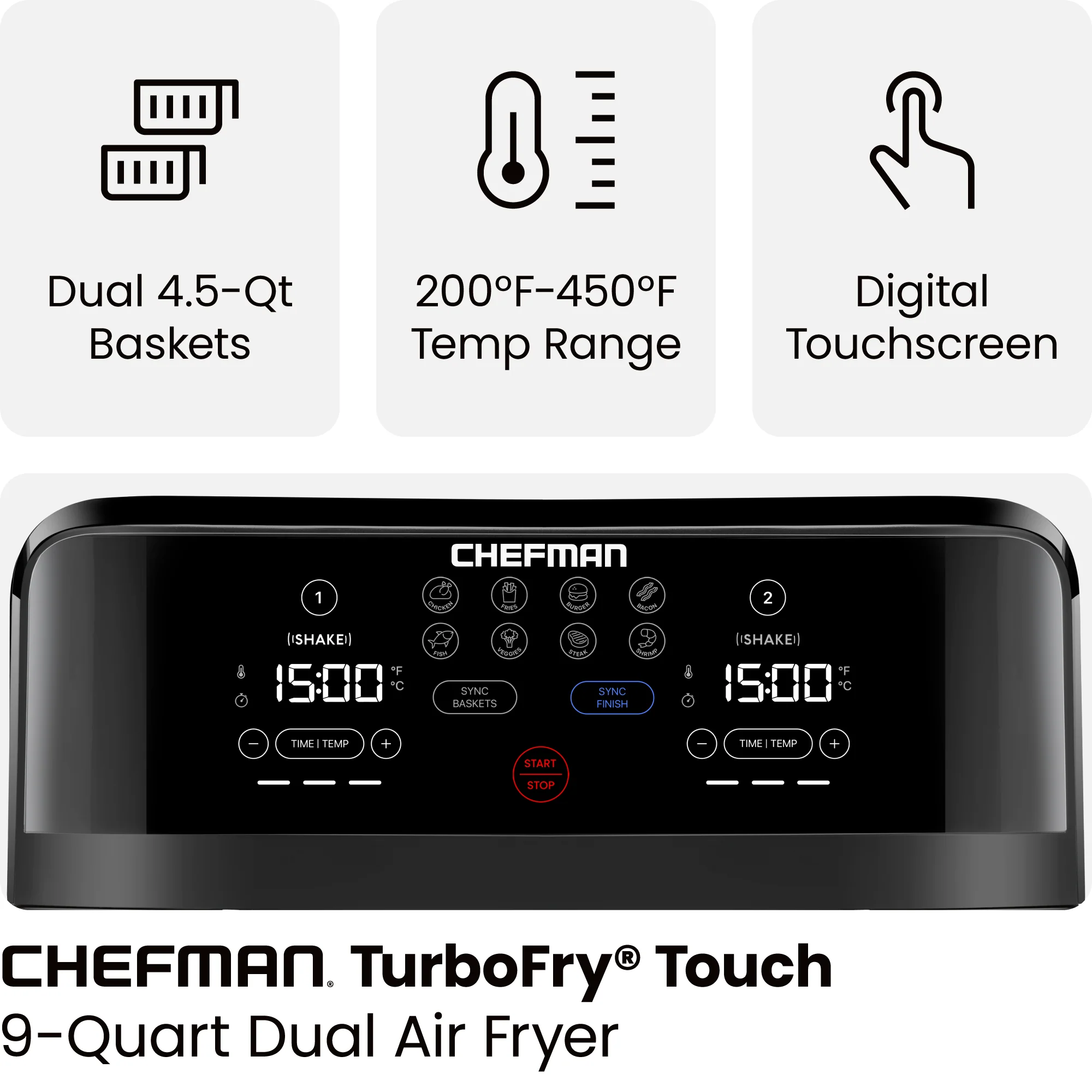Introducing the Chefman Dual Air Fryer: it's perfect for cooking two different foods simultaneously with independent touchscreen controls for each 4.5-quart basket. Enjoy crispy meals with 8 cooking presets and an adjustable temperature range of 200–400°F. Cleanup is easy with dishwasher-safe nonstick baskets. Make mealtime a breeze with this versatile air fryer!